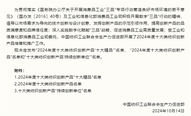 導讀:近日,中國紡織工業(yè)聯(lián)合會生產(chǎn)力促進部發(fā)布了“2024年度十大類紡織創(chuàng)新產(chǎn)品‘十大精品’”名單、“2024年度十大類紡織創(chuàng)新產(chǎn)品”名單和“十大類紡織創(chuàng)新產(chǎn)品‘持續(xù)創(chuàng)新單位’”名